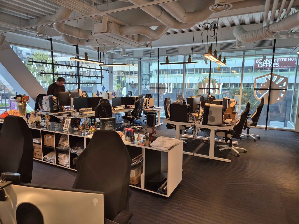 Wij kregen een rondleiding door hun indrukwekkende kantoor. In de hal staan tientallen prijzen uitgestald. Natuurlijk staan er overal computers en schermen waarop games gespeeld kunnen worden. Je hebt weinig voorstellingsvermogen nodig om je voor te stellen dat hier een internationaal topteam in esports gehuisvest is.